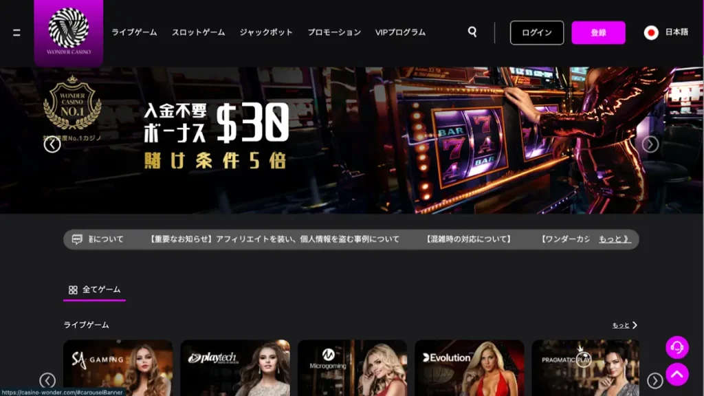 - ボーナス利用規約 : https://casino-wonder.com/terms/condition